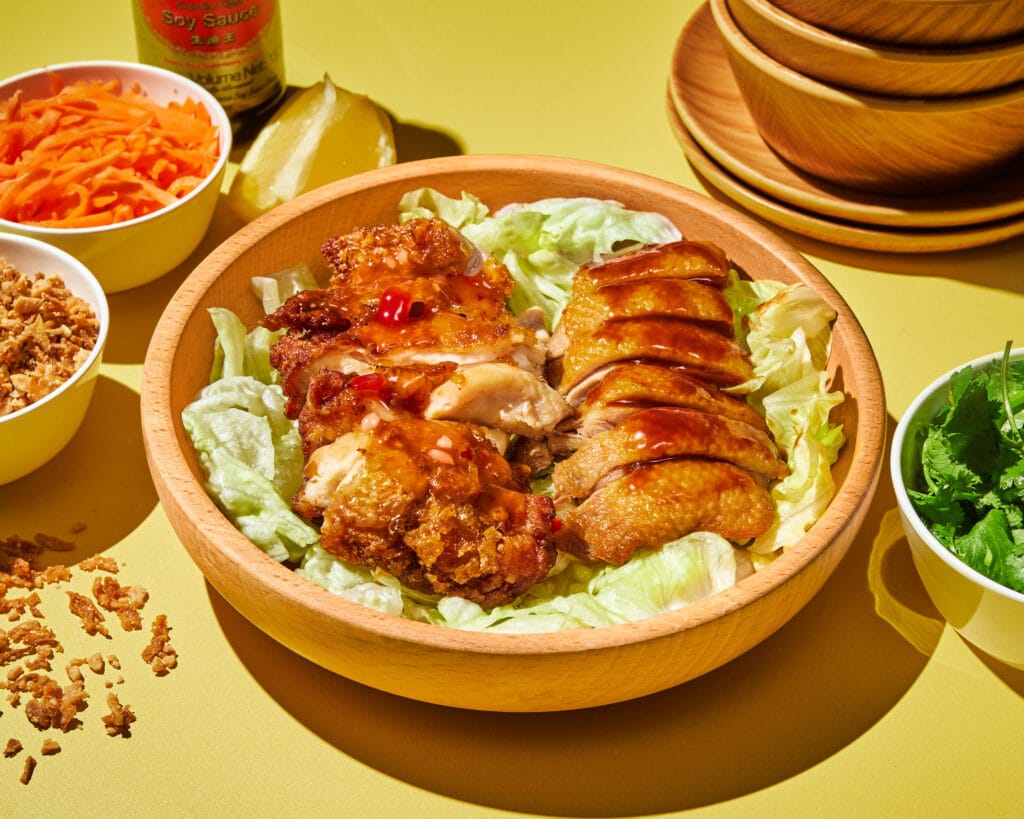 1/2 crousty poulet servis avec sauce aigre douce chili et 1/2 canard laqué servis avec sauce barbecue